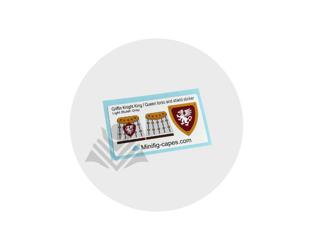 Upgrade your minifigs with this Griffin Knight King & Queen inspired torso and shield sticker set in light bluish gray! Made from high-quality, durable vinyl, these stickers are easy to apply and perfect for royal characters, knights, and medieval builds. Minifigs not included.