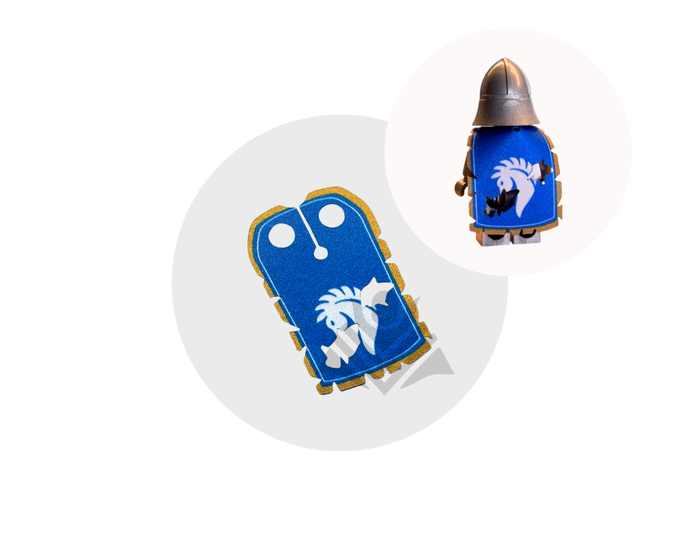 Give your minifig a battle worn, heroic look with this long Horse Knight inspired cape featuring a damaged style. Made from high quality fabric, it is durable and easy to put on, perfect for veteran knights, epic battles, and medieval scenes. Minifig not included.