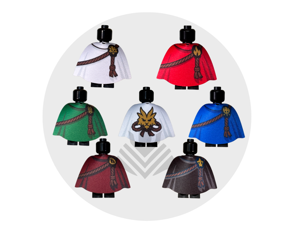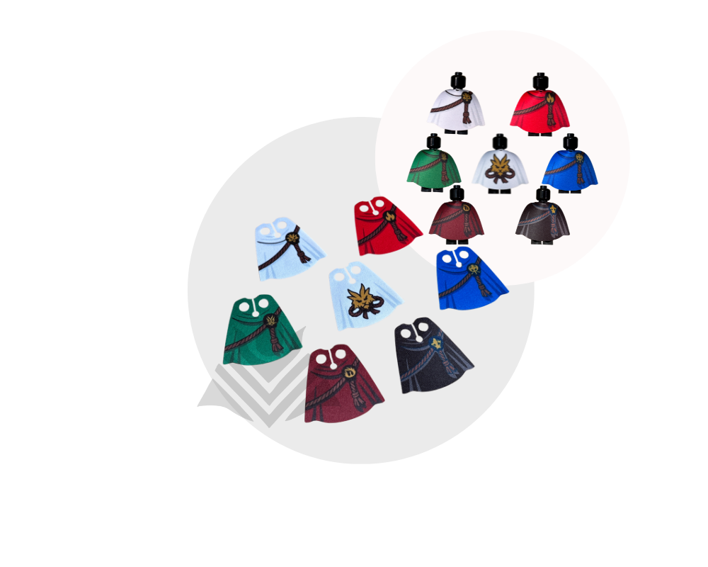 Equip your minifigs with the full OG Ninja look with this complete cape pack! Includes capes for Kai, Jay, Zane, Lloyd, Nya, Cole and Ninja master Wu. Made from high-quality fabric, each cape is durable and easy to put on. Perfect for ninja teams, martial arts scenes, and custom collections! Minifigs not included.