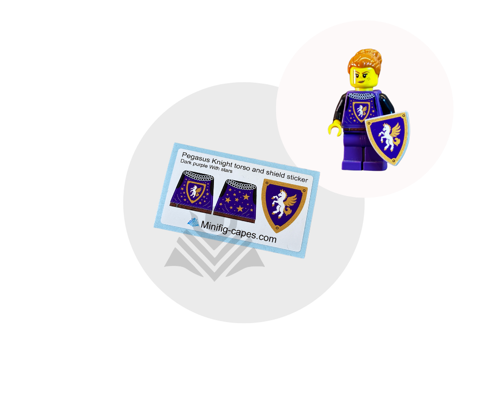 Customize your minifig with this star-detailed Pegasus Knight inspired torso and shield sticker set! Made from high-quality, durable vinyl, these stickers are easy to apply and perfect for magical warriors, fantasy themes, and medieval displays. Minifig not included.