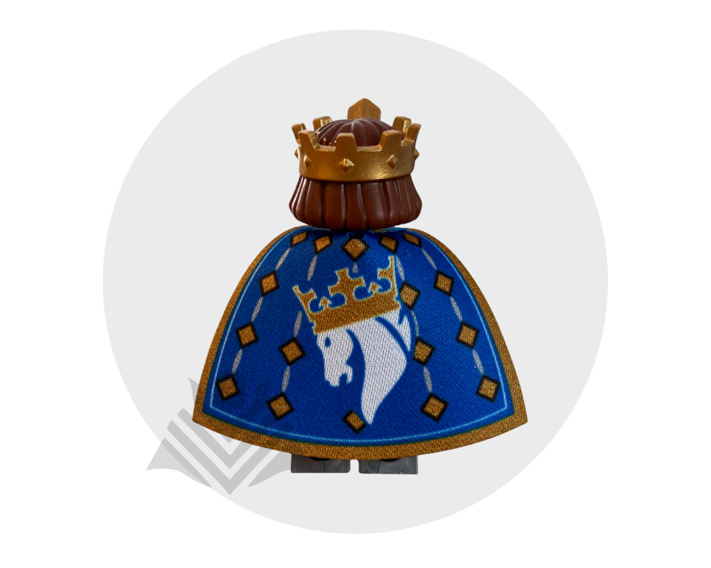Give your minifig a royal and majestic look with this Horse Knight King-inspired cape in blue, featuring a printed crown design! Made from high-quality fabric, it’s durable and easy to put on. Perfect for kings, knights, and medieval champions! Minifig not included.