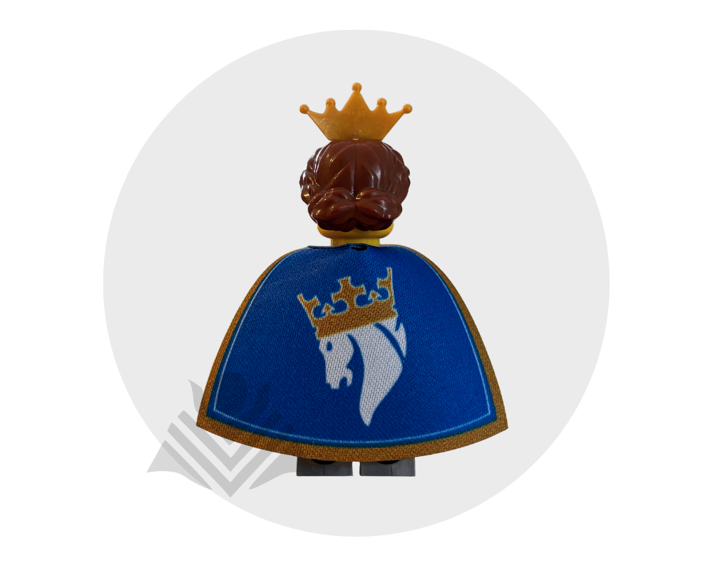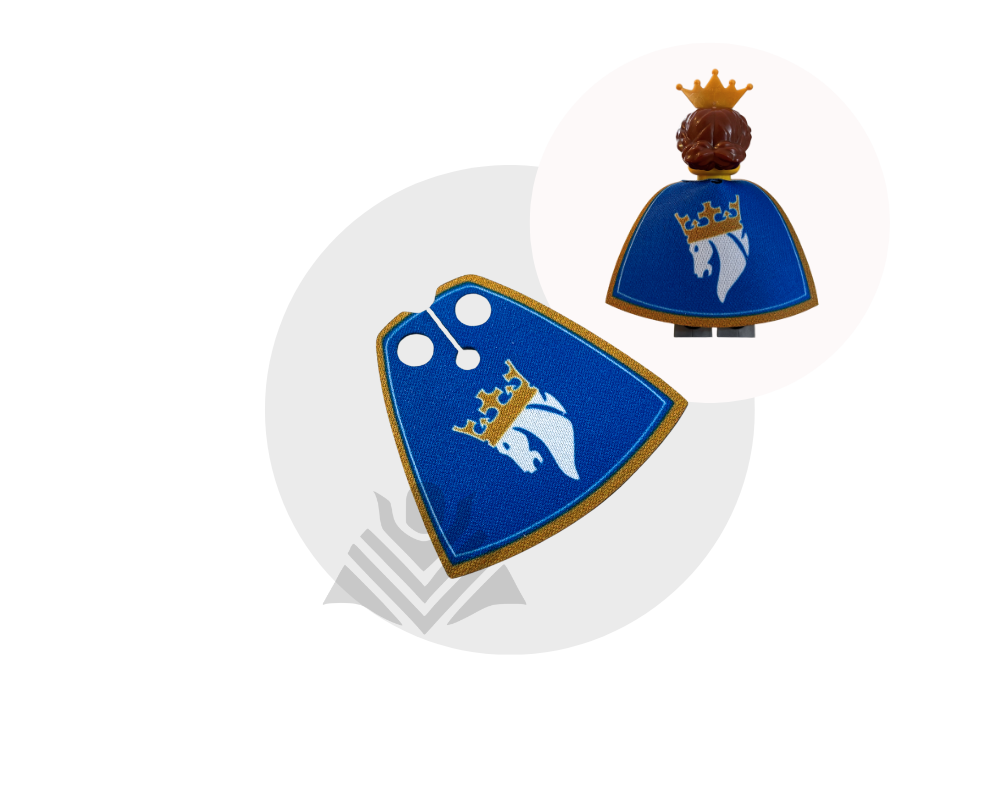 Give your minifig a royal and majestic look with this Horse Knight King-inspired cape in blue, featuring a printed crown design! Made from high-quality fabric, it’s durable and easy to put on. Perfect for kings, knights, and medieval champions! Minifig not included.