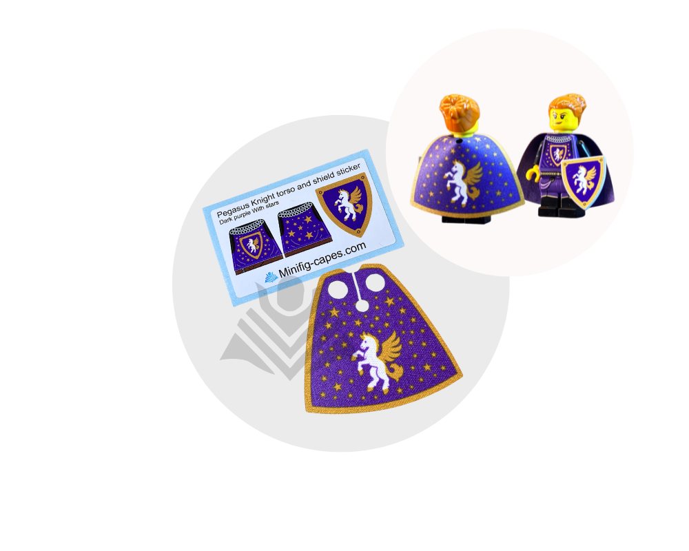 Give your minifig a magical, royal look with this Pegasus Knight with Stars pack! Includes the Pegasus Knight Cape with Stars and the Pegasus Knight Torso and Shield Sticker with Stars. Made from high-quality fabric and durable vinyl, it’s perfect for fantasy heroes and enchanted medieval builds. Minifig not included.