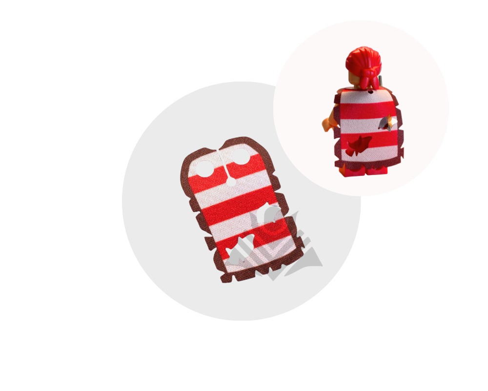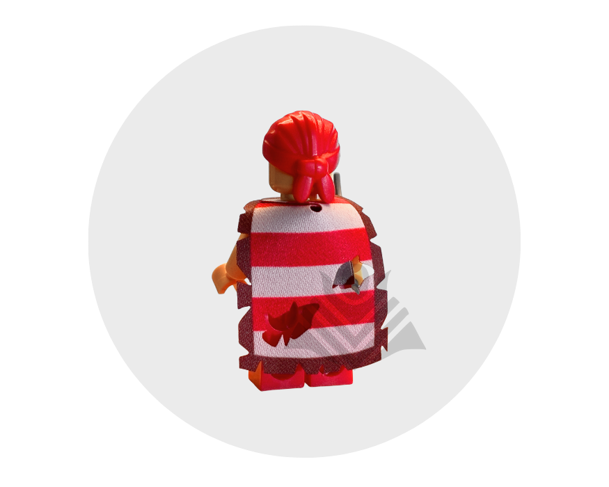Give your minifig a rugged pirate look with this red and white pirate inspired cape featuring a damaged style. Made from high quality fabric, it is durable and easy to put on, perfect for sea raiders, captains, and adventurous displays. Minifig not included.